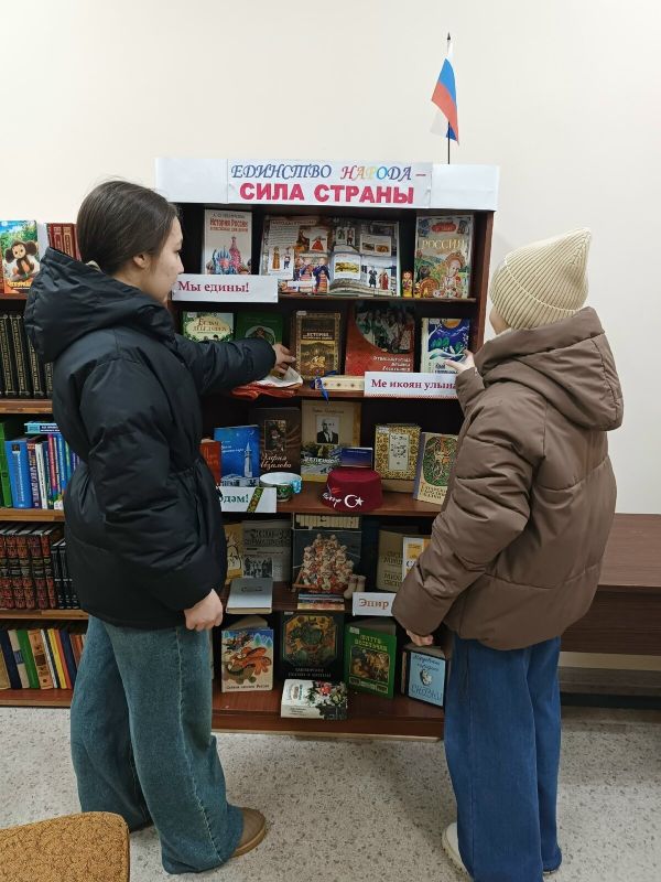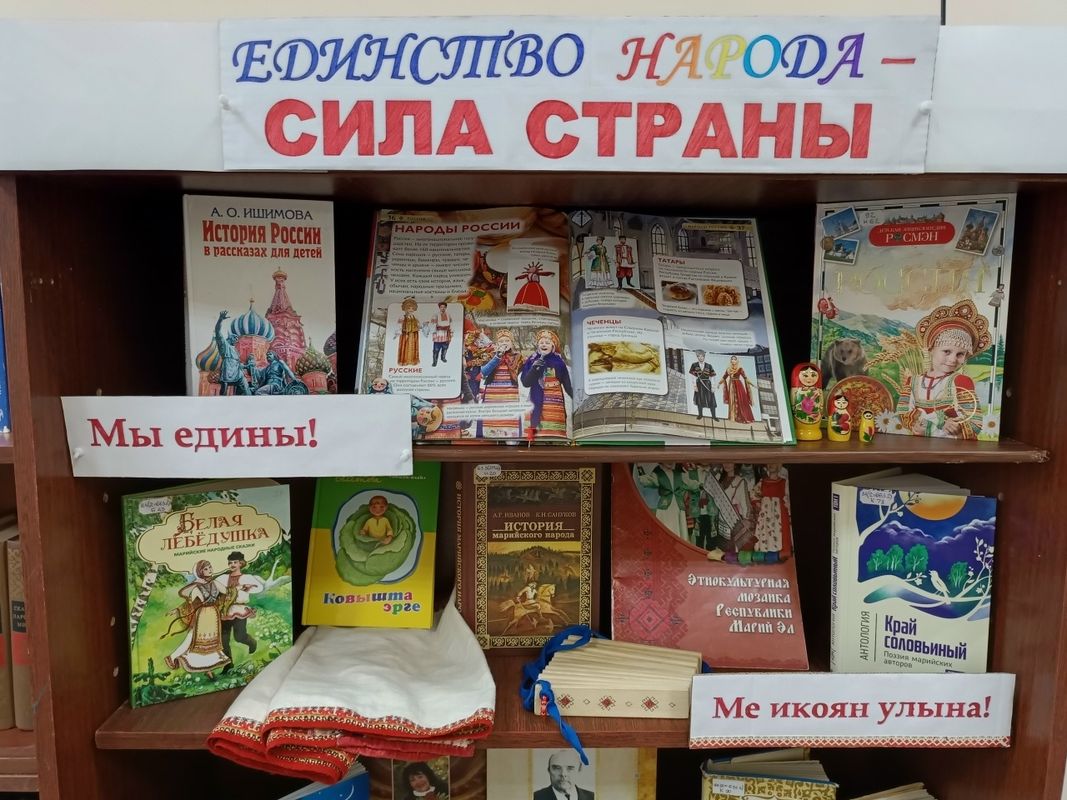 В рамках Года единства народов России в читальном зале Приволжской библиотеки открылась книжная выставка-инсталляция «Единство народа — сила страны». Она посвящена многообразию культур, дружбе и сплочённости народов нашей страны.