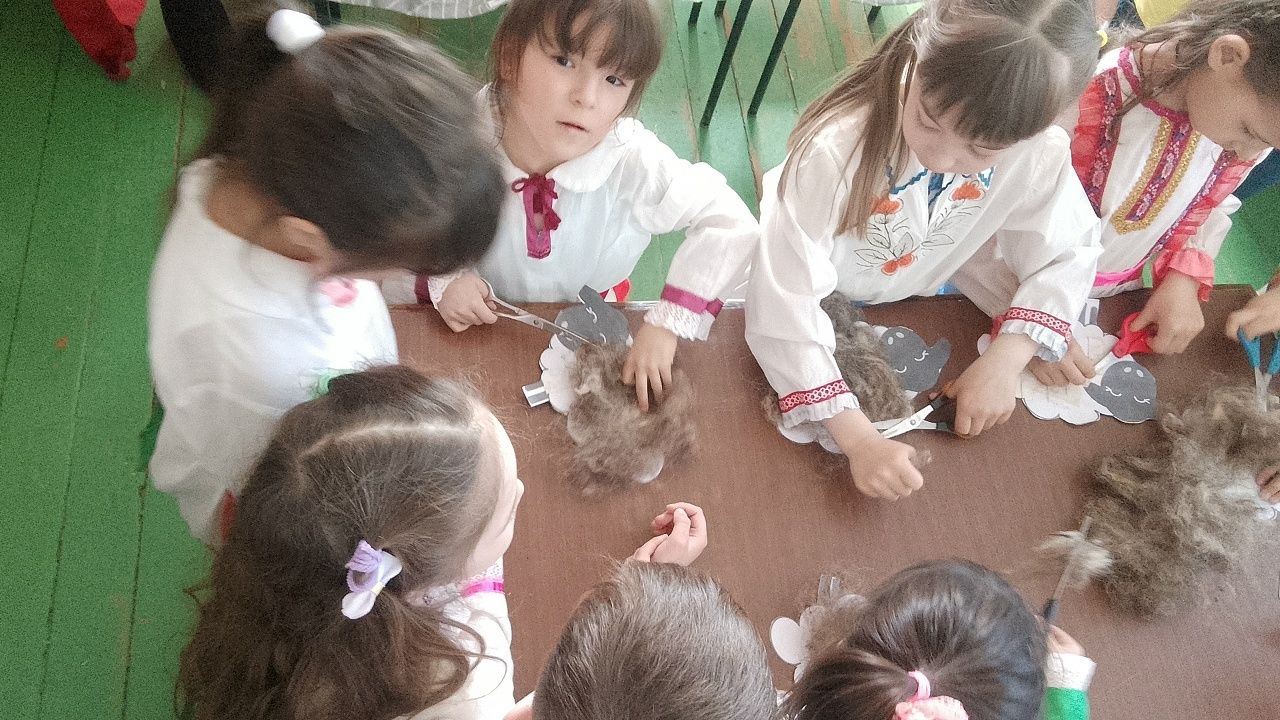 После «стрижки» шаблонов каждый ребёнок смог подержать в руках настриженную шерсть. Дети с восторгом ощущали её мягкость и тепло.