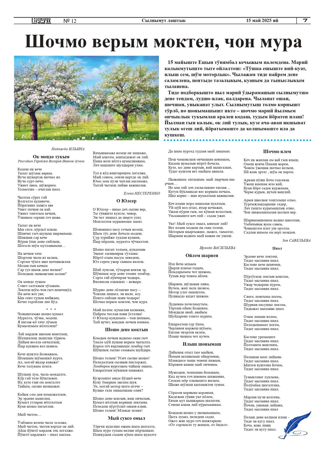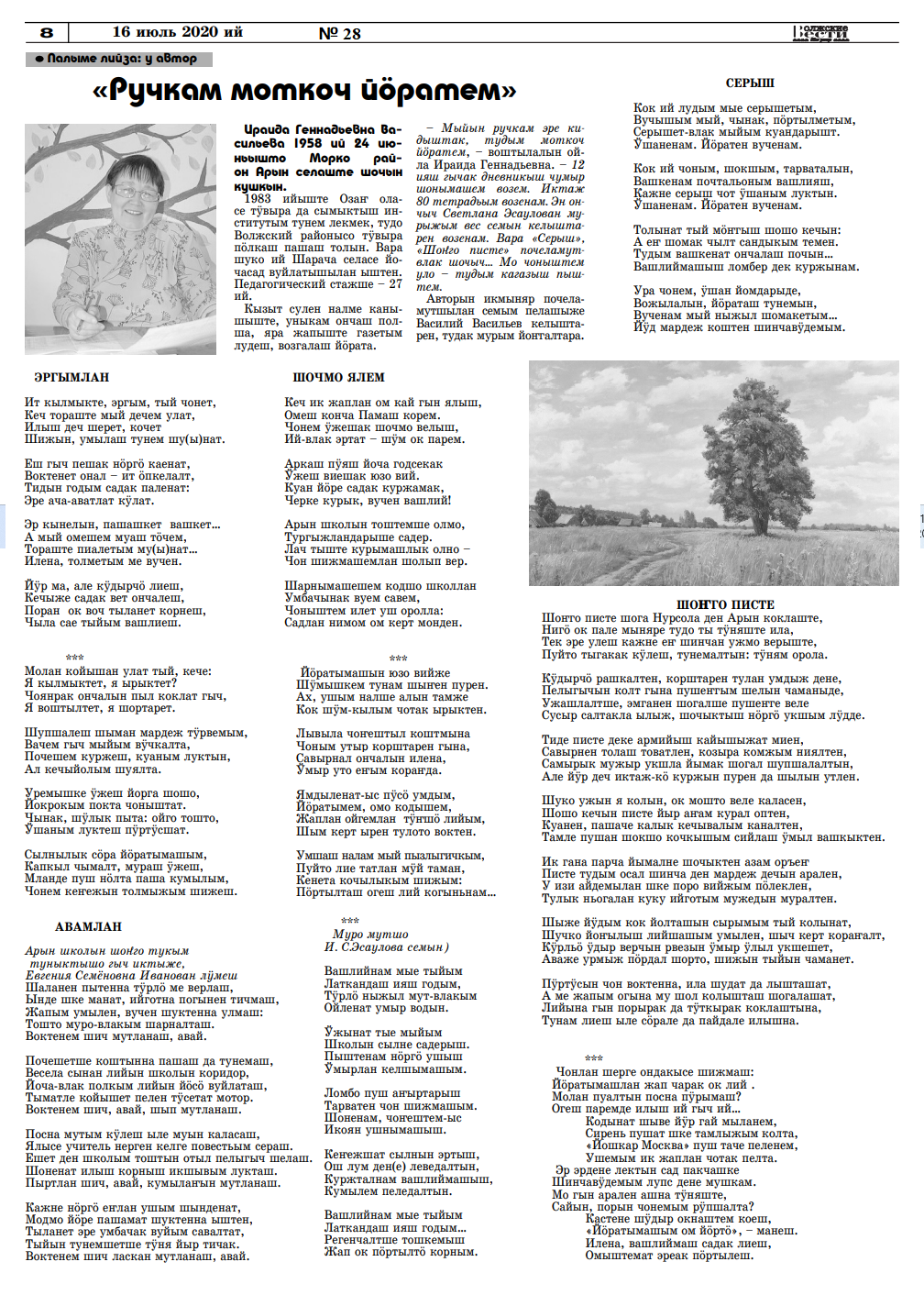 - Васильева, И. Шочмо верым моктен, чон мура : почеламут-влак / Ираида Васильева // Волжские вести. – 2025. – 15 май (№ 18). - С. 7.
