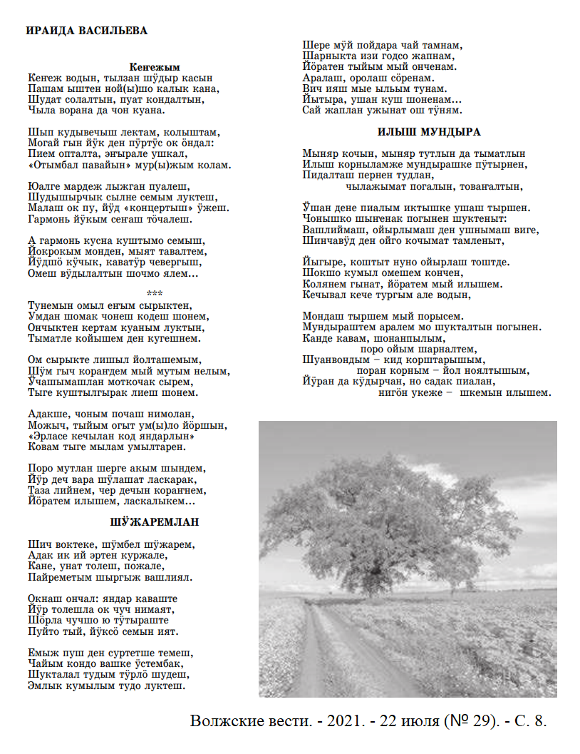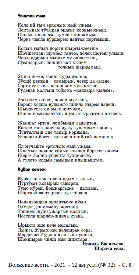 - Васильева, И. Кенежым ; Шужаремлан ; Илыш мундыра : почеламут-влак / Ираида Васильева // Волжские вести. – 2021. - 22 июля (№ 29). - С. 8.