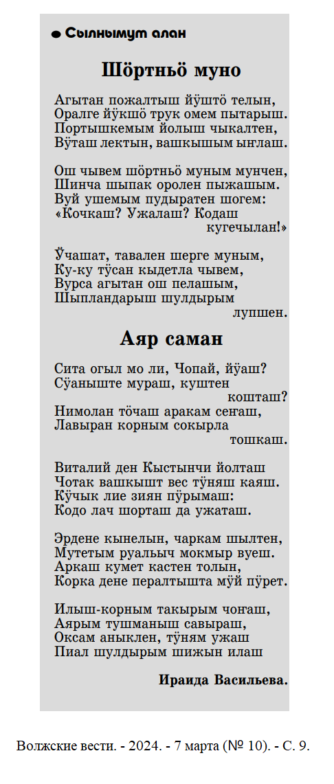 - Васильева, И. Шортньо муно ; Аяр саман : почеламут-влак / Ираида Васильева // Волжские вести. – 2024. – 7 марта (№ 10). - С. 8.