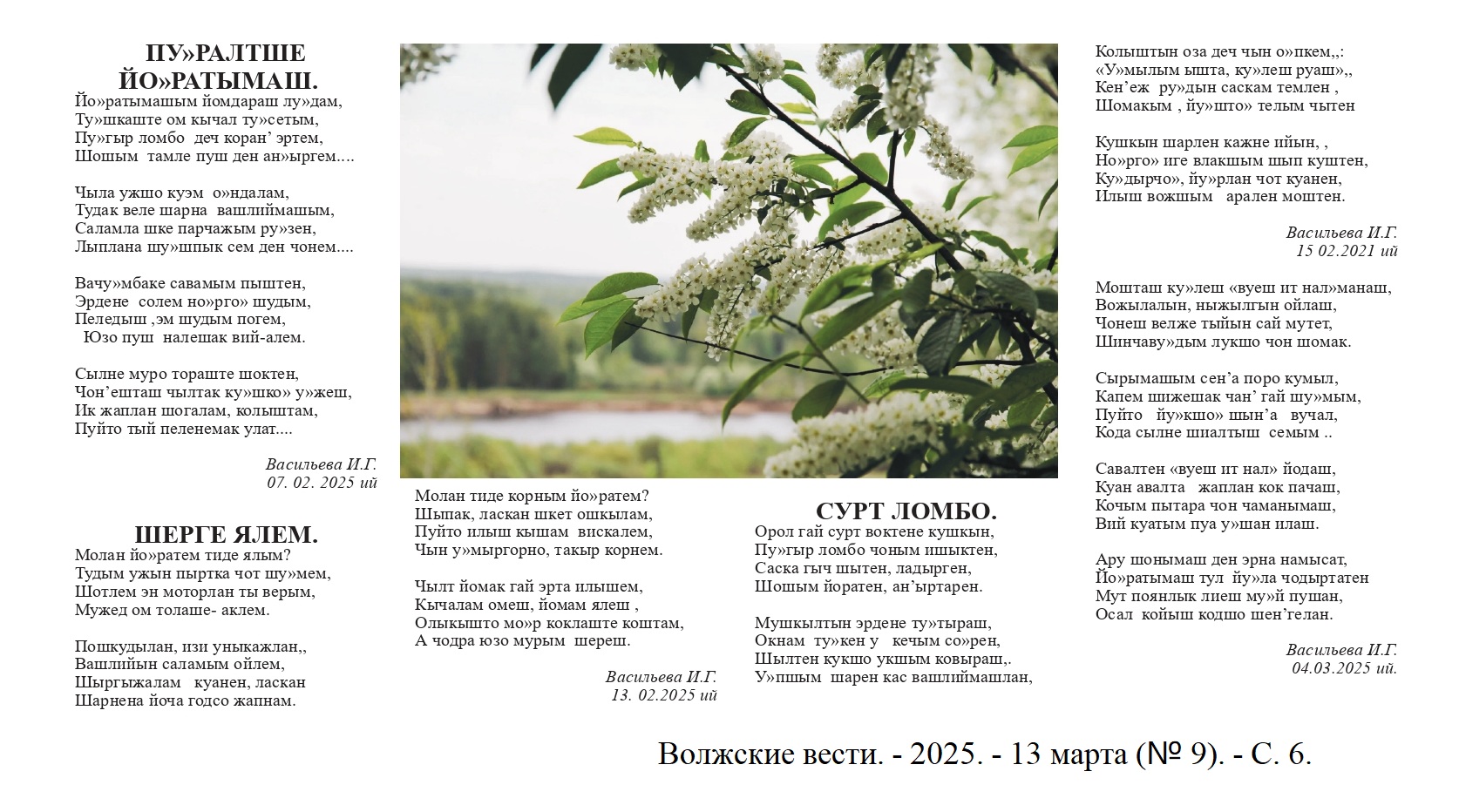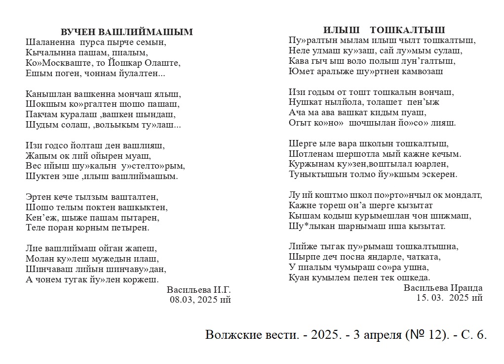 - Васильева, И. Вучен вашлиймашым ; Илыш тошкалтыш : почеламут-влак / Ираида Васильева // Волжские вести. – 2025. – 3 апреля (№ 12). - С. 6.