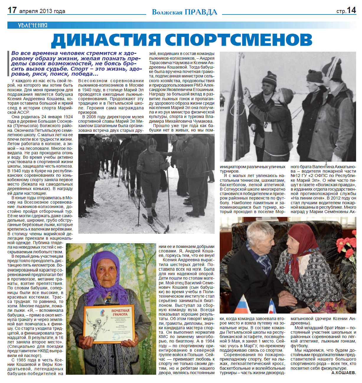 - Кошаев, А. Династия спортсменов / А. Кошаев // Волжская правда. – 2013. - 17 апреля (№ 16). - С. 14.