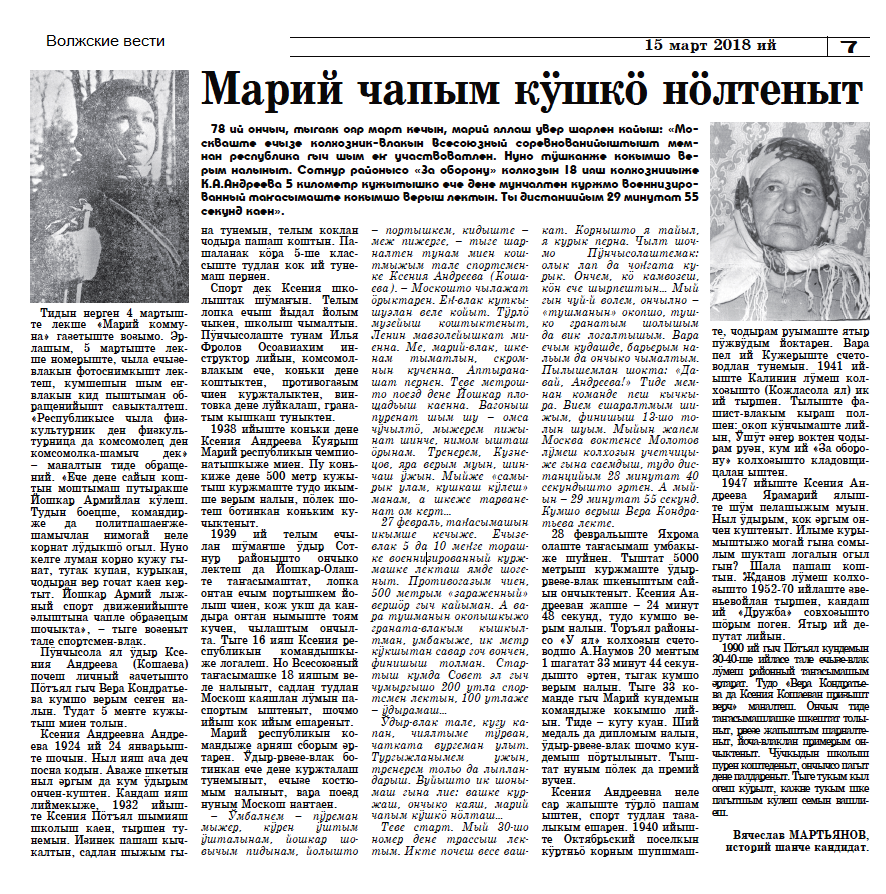 - Мартьянов, В. Марий чапым кушко нолтеныт / В. Мартьянов // Волжские вести. – 2018. - 15 март (№ 11). - С. 7.