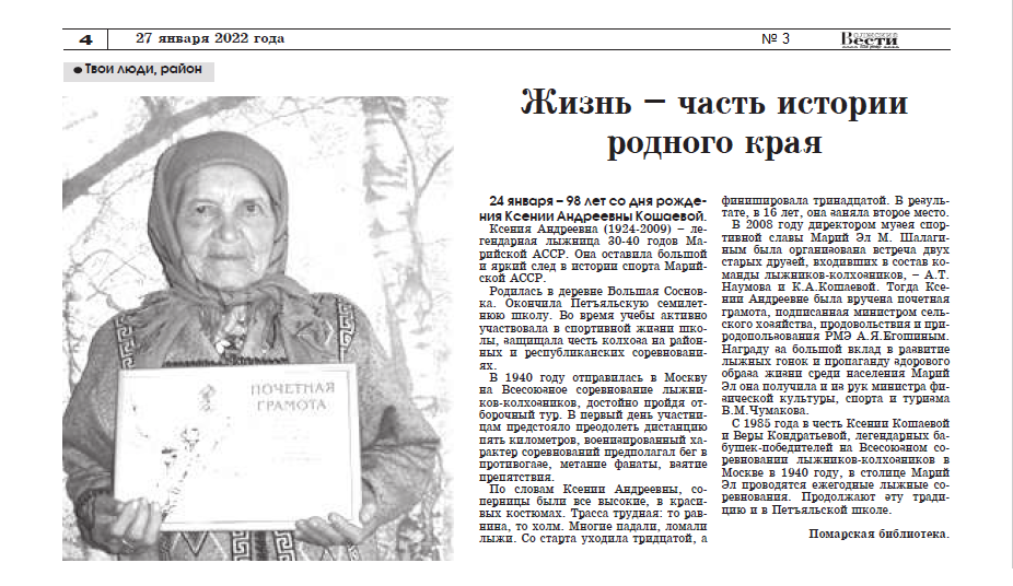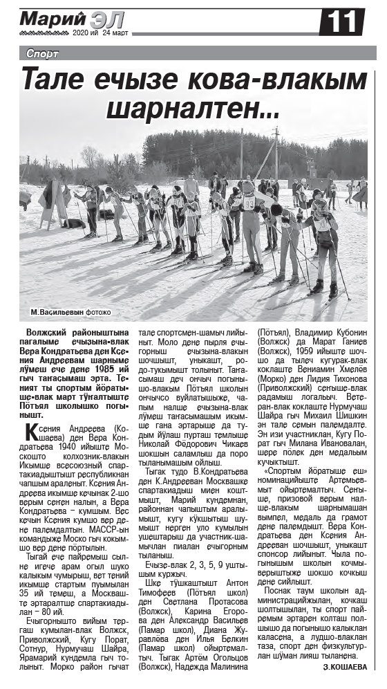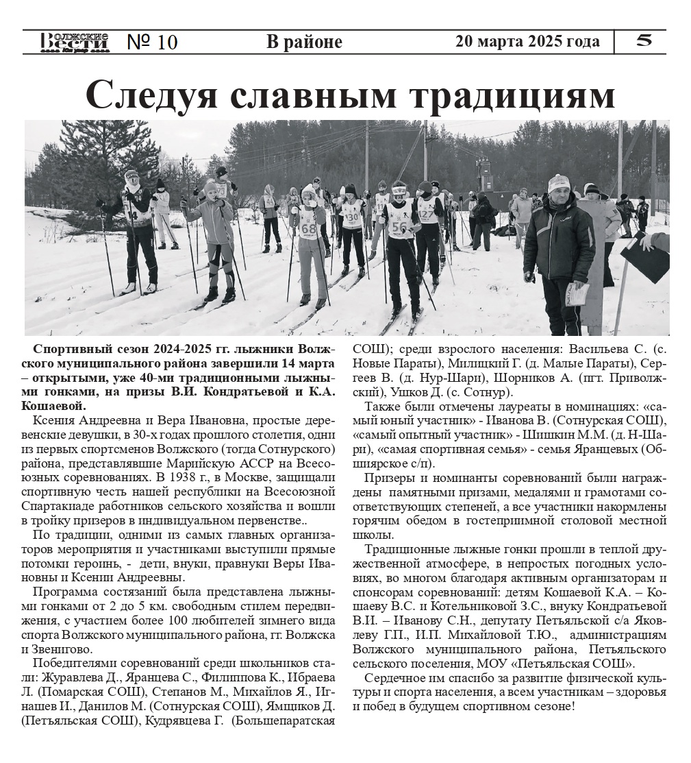 - Следуя славным традициям : [лыжные гонки, посвященные В. И. Кондратьевой и К. А. Кошаевой] // Волжские вести. – 202 - 20 марта (№ 10). - С. 5.