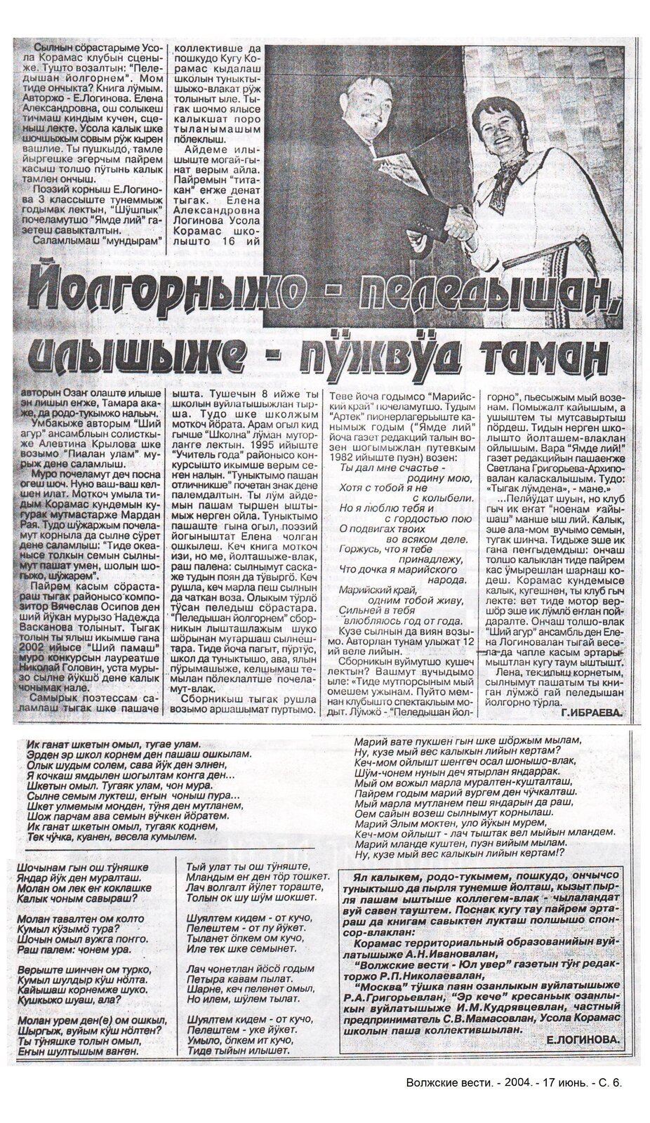 1. Ибраева, Г. Йолгорныжо – пеледышан, илышыже – пӱжвӱд таман / Галина Ибраева // Волжские вести. – 2004. – 17 июнь. – С. 6.