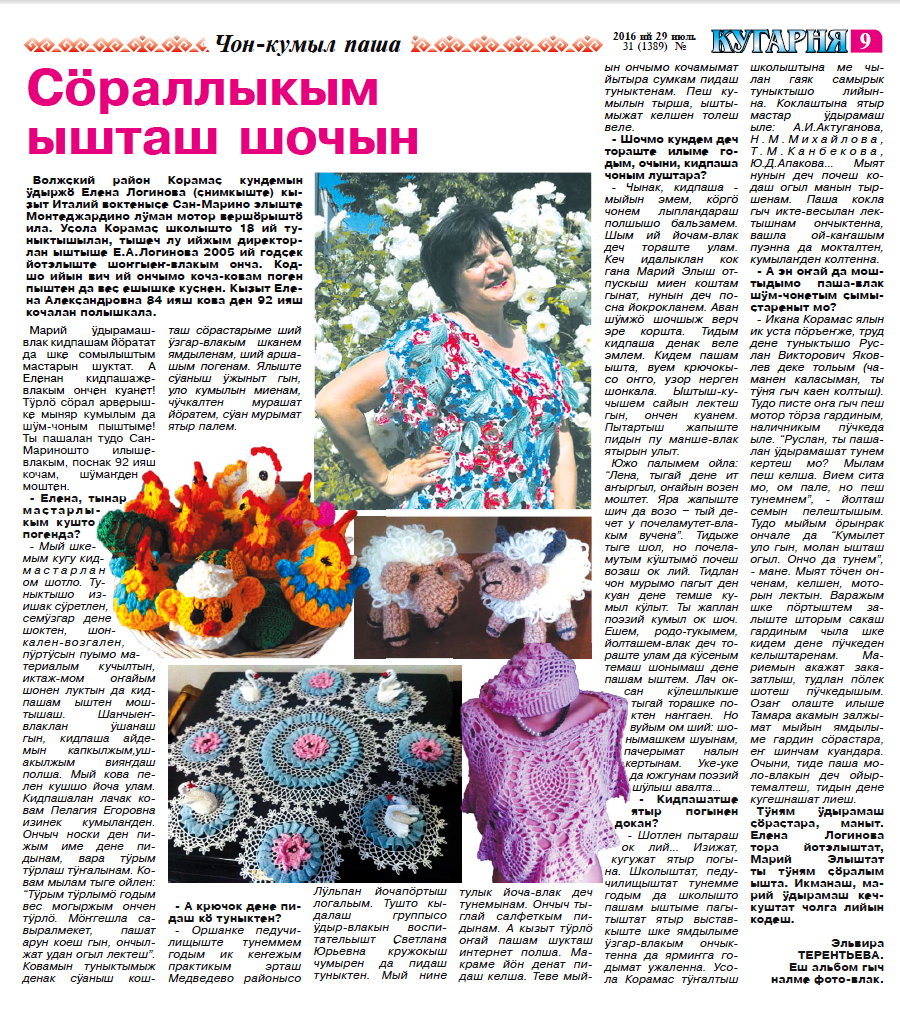2. Нестеренко-Логинова, Е. А. Сӧраллыкым ышташ шочын / Елена Нестеренко-Логинова ; Эльвира Терентьева мутланен // Кугарня. – 2016. – 29 июль (№ 31). – С. 9.