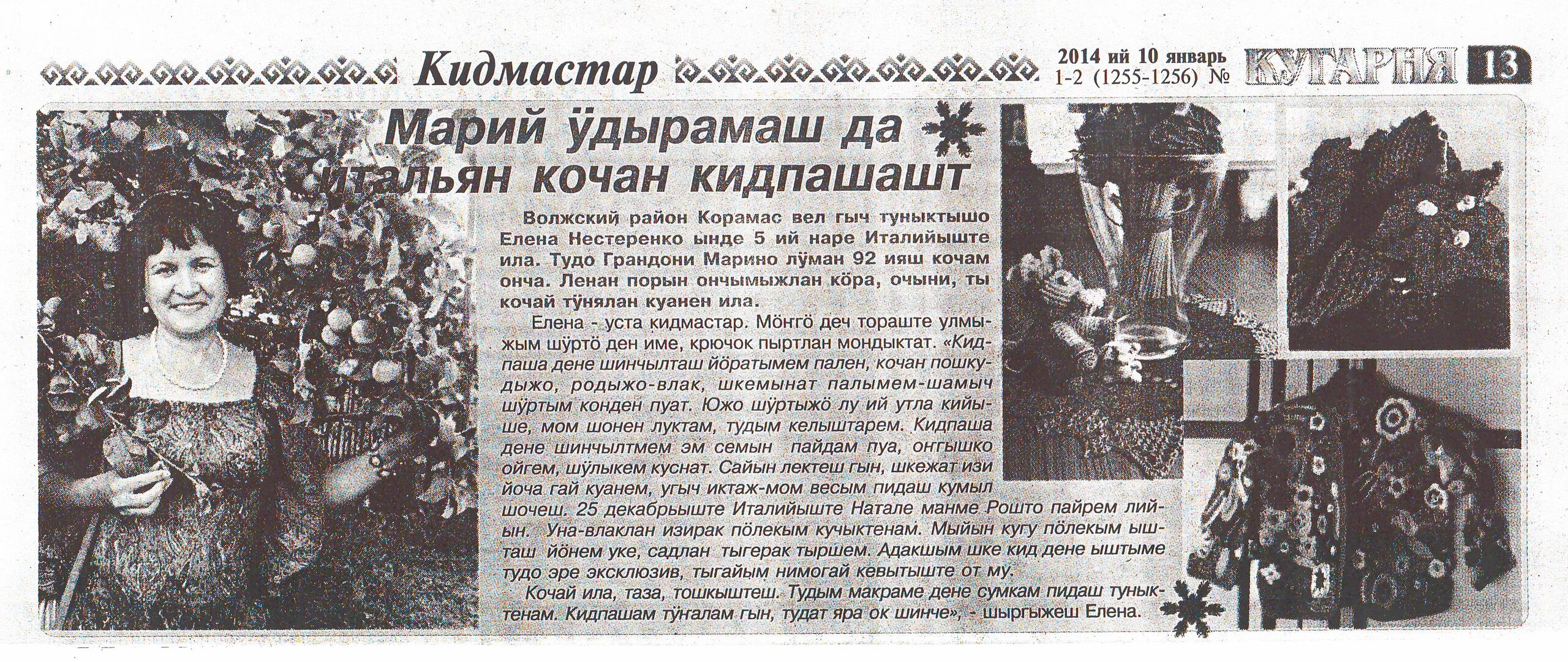 3. Иванова, Т. Марий ӱдырамаш да итальян кочан кидпашашт / Татьяна Иванова // Кугарня. – 2014. – 10 январь (№ 1-2). – С. 1