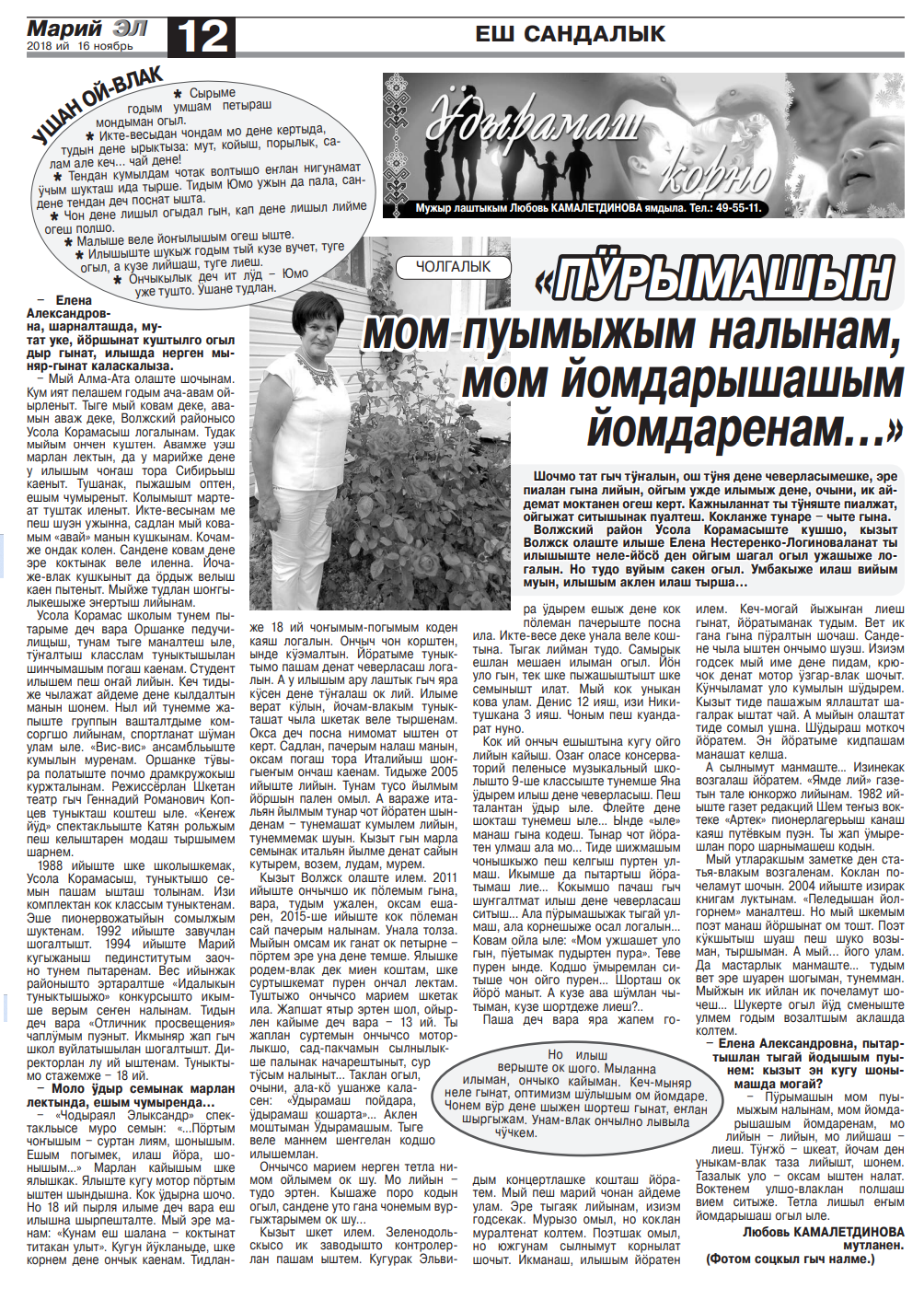 5. Нестеренко-Логинова, Е. А. «Пӱрымашын мом пуымыжым налынам, мом йомдарымашым йомдаренам…» / Елена Нестеренко-Логинова ; Любовь Камалетдинова мутланен // Марий Эл. – 2018. – 16 ноябрь. – С. 12.