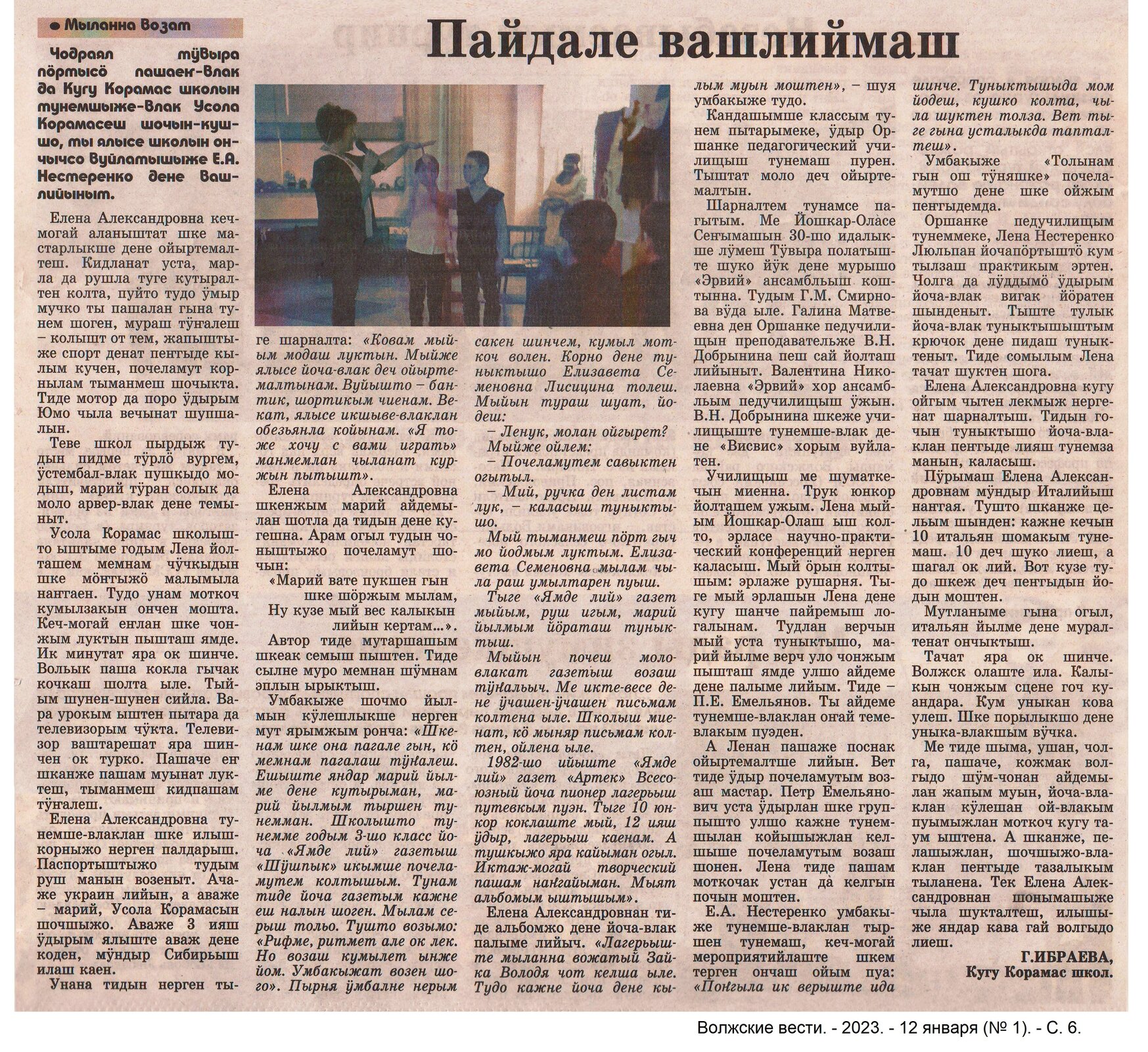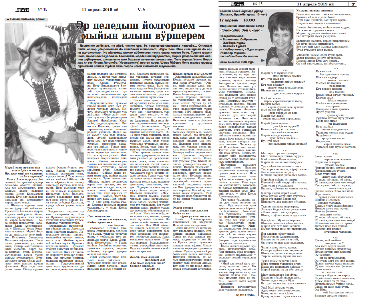 7. Иванова, Ю. Эр пеледыш йолгорнем – мыйын илыш вӱршерем / Ю. Иванова // Волжские вести. – 2019. – 11 апрель (№ 15). – С. 6-