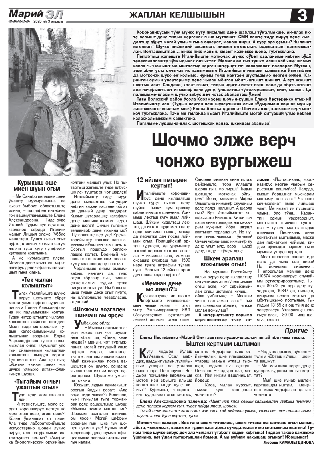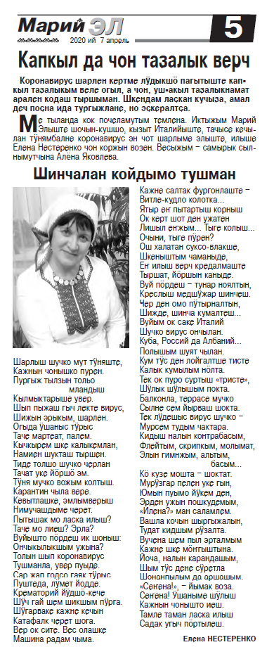 8. Камалетдинова, Л. Шочмо элже верч чонжо вургыжеш / Любовь Камалетдинова // Марий Эл. – 2020. – 3 апрель. – С. 3.