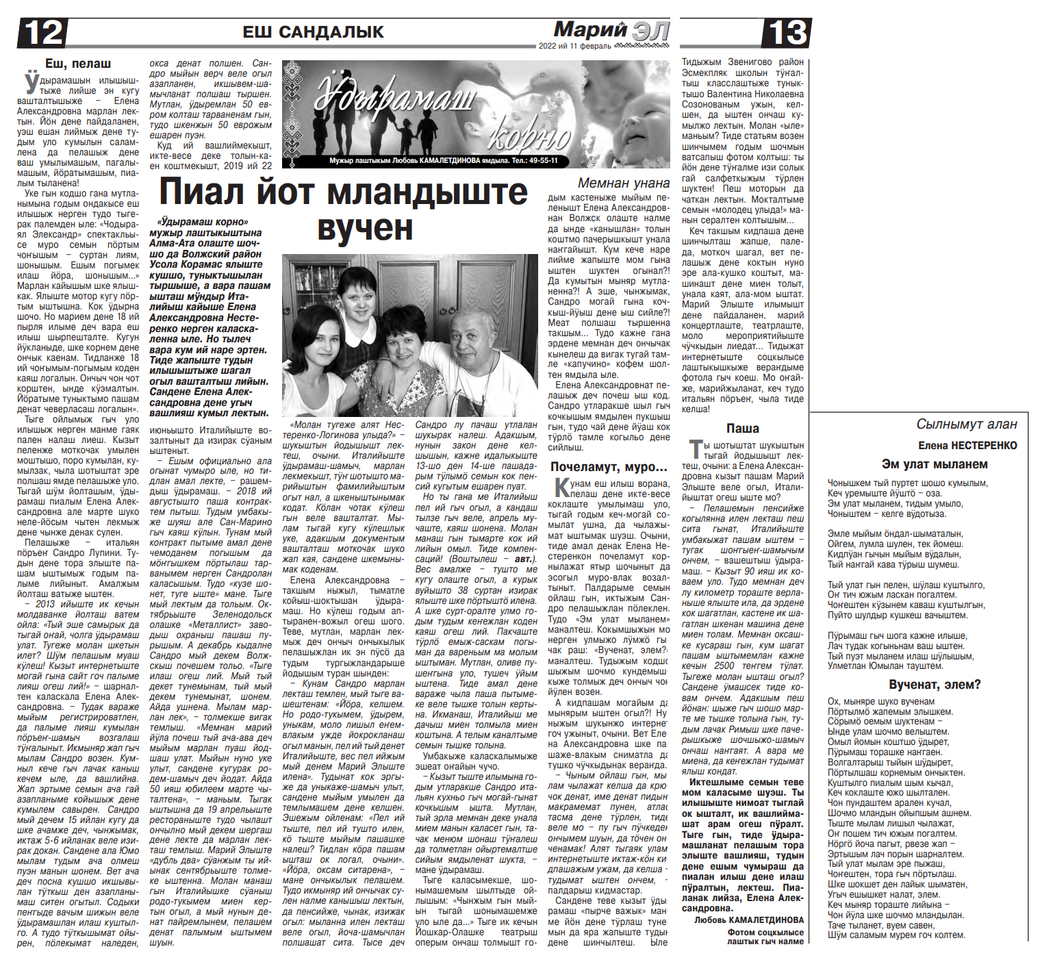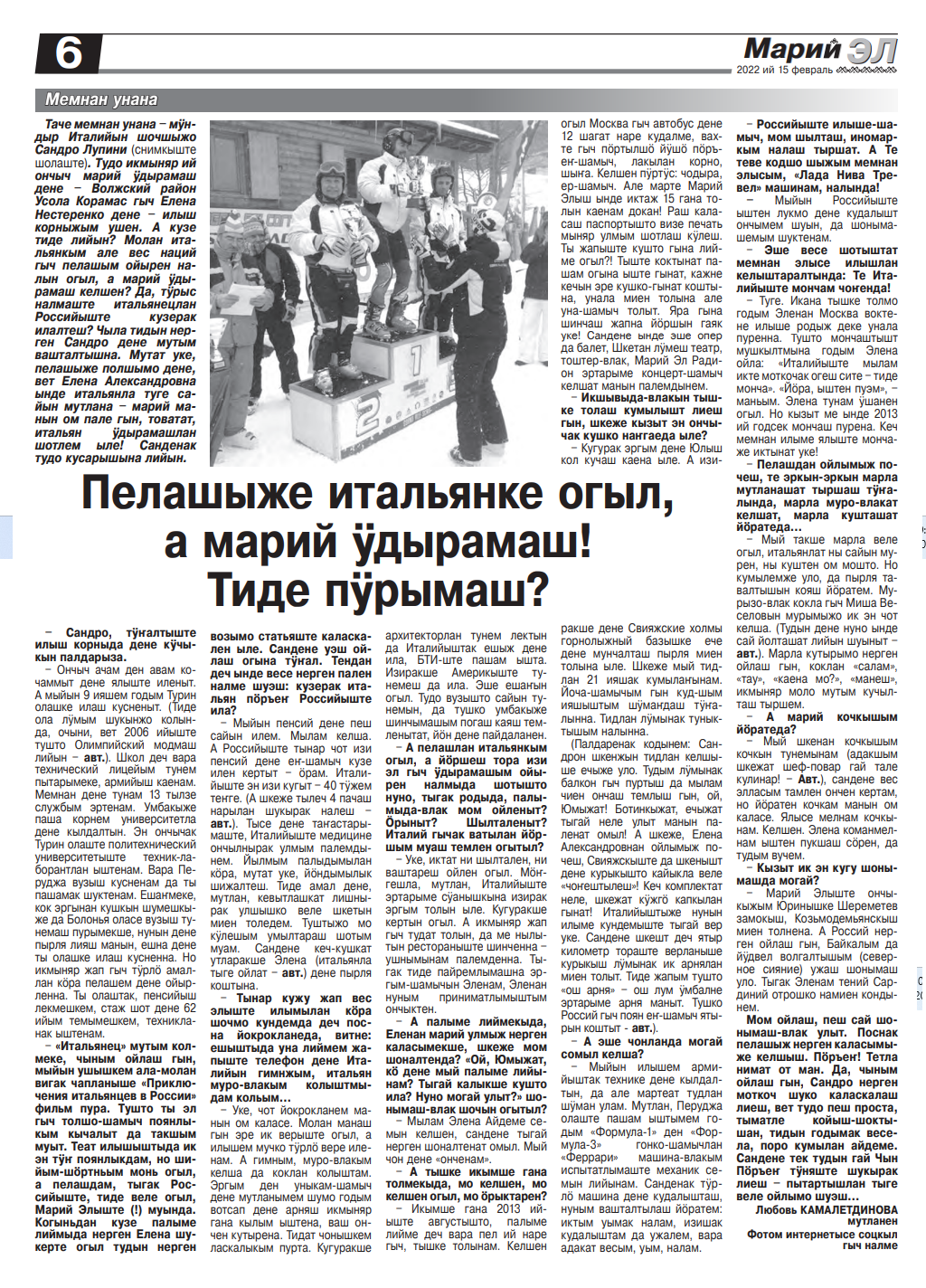 11. Лупини, С. Пелашыже итальянке огыл, а марий ӱдырамаш! Тиде пӱрымаш? / Сандро Лупини ; Любовь Камалетдинова мутланен // Марий Эл. – 2022. – 15 февраль. – С. 6.