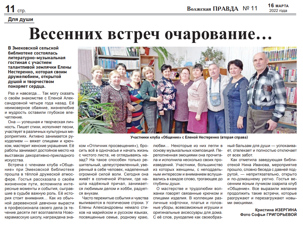 12. Изергина, К. Весенних встреч очарование… / Кристина Изергина // Волжская правда. – 2022. – 16 марта (№ 11). – С. 11.