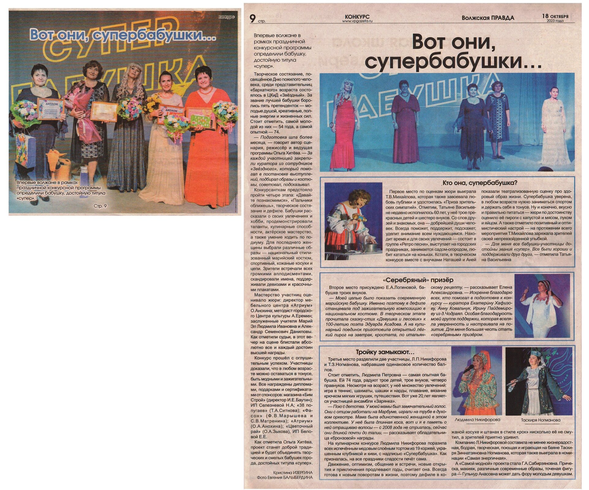 14. Изергина, К. Вот они, супербабушки… / Кристина Изергина // Волжская правда. – 2023. – 18 октября (№ 42). – С. 1, 9.