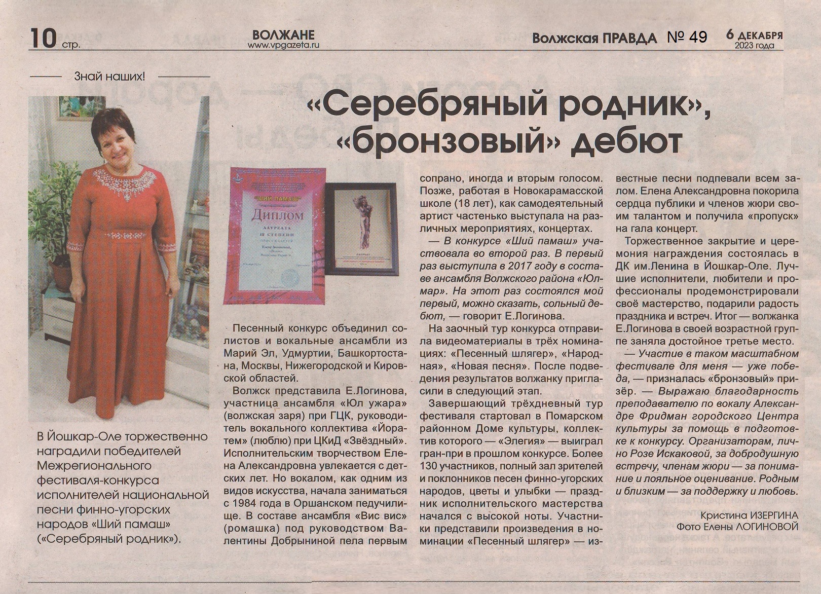 15. Изергина, К. «Серебряный родник», «бронзовый» дебют / Кристина Изергина // Волжская правда. – 2023. – 6 декабря (№ 49). – С. 10.