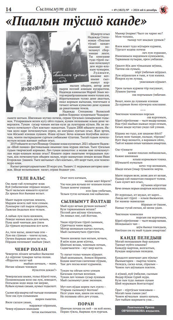 - Овчинникова, И. «Пиалын тусшо канде» / Ирина Овчинникова // Кугарня. – 2024. – 6 декабрь (№ 49). – С. 14.