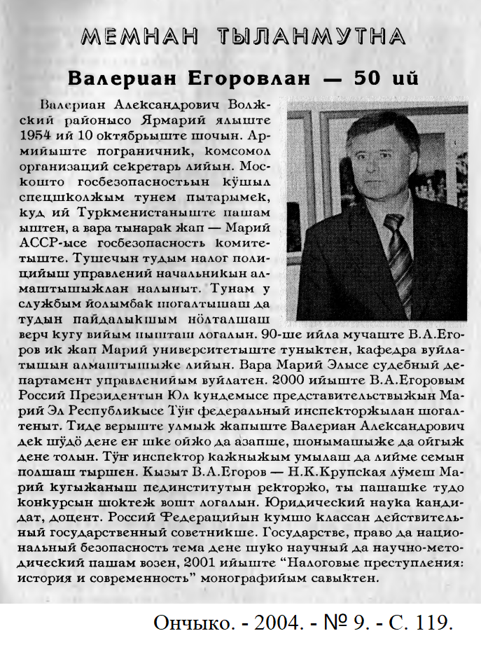 - Валериан Егоровлан – 50 ий // Ончыко. – 2004. - № 10. – С. 119.