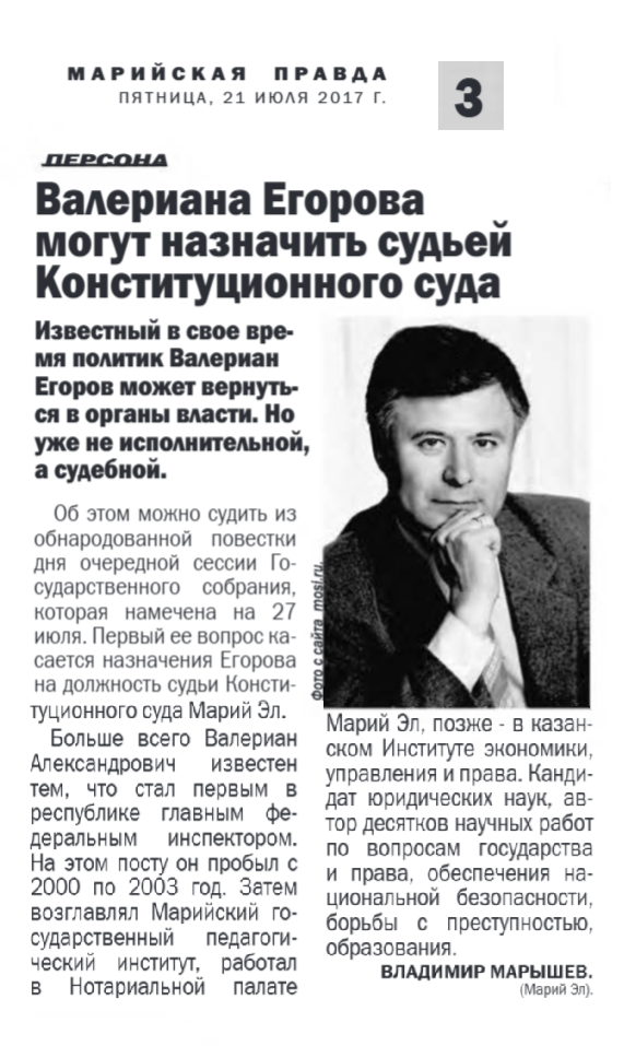 - Марышев, В. Валериана Егорова могут назначить судьей Конституционного суда / Владимир Марышев // Марийская правда. – 2017. – 21 июля. – С. 3.