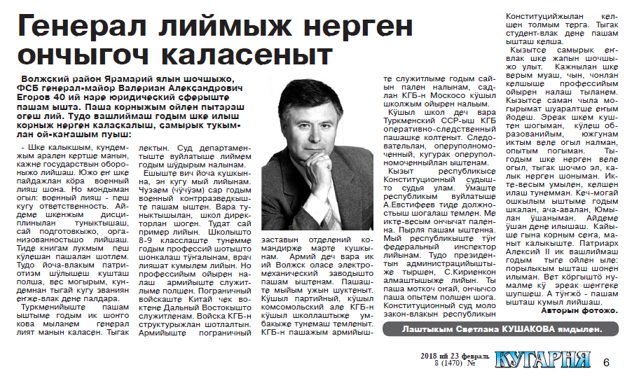 - Кушакова, С. Генерал лиймыж неген ончыгоч каласеныт / Светлана Кушакова // Кугарня. – 2018. – 23 февраль (№ 8). – С. 6.