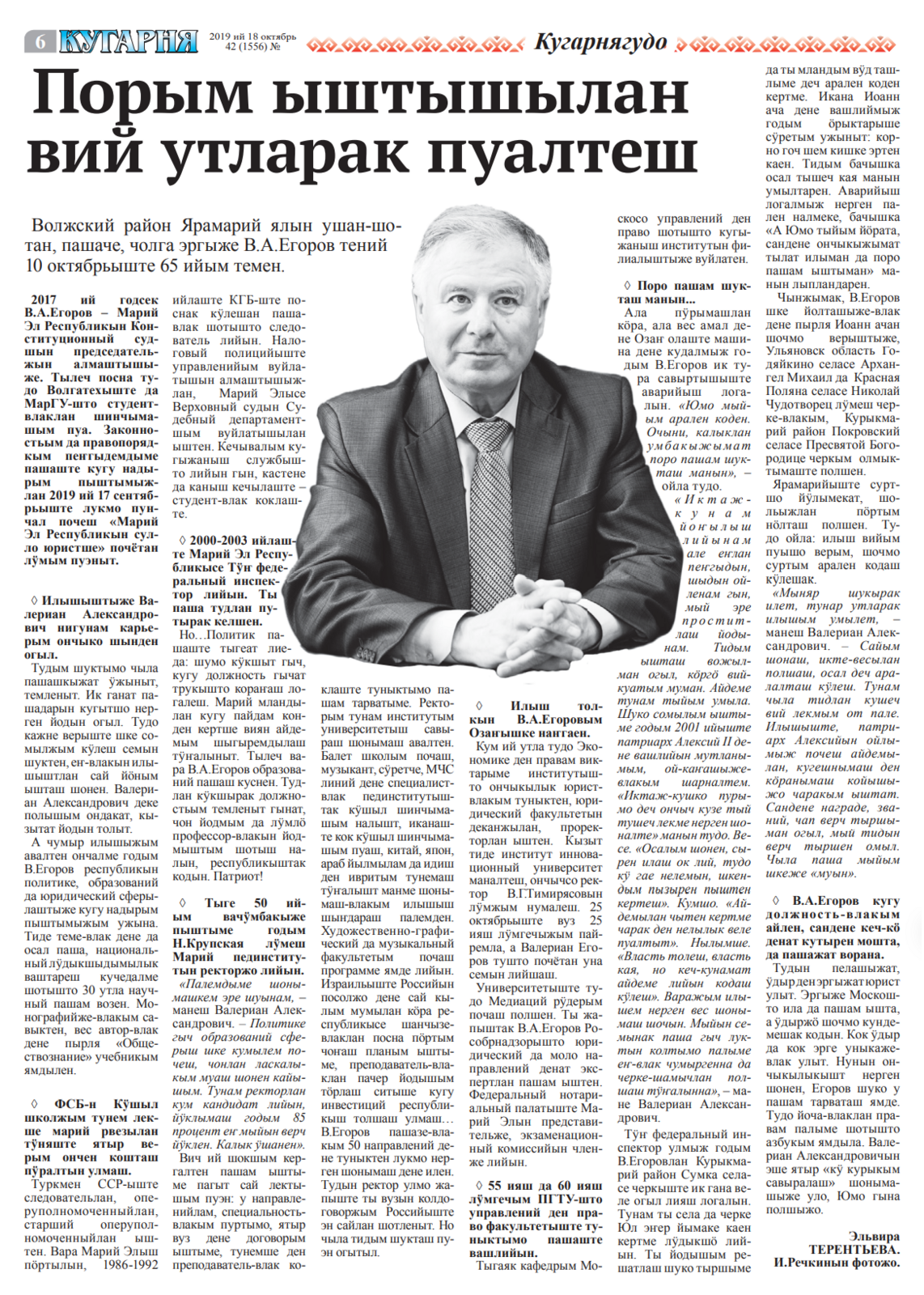 - Егоров, В. А. Порым ыштышылан вий утларак пуалтеш : [Марий Эл Республикысе икымше Тун федерал инспектор, Марий Кугыжаныш пединситутын ректоржо, Марий Эл Конституционный суд председательын алмаштышыже, юридический науко кандидат Валериан Александрович Егоров дене мутланымаш] / Эльвира Терентьева возен налын // Кугарня. – 2019. – 18 октябрь (№ 42). – С. 6.