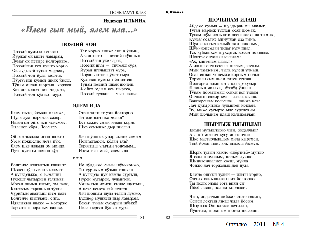 2. Ильина, Н. "Ты мландыште ынем лий умыл..." : почеламут-влак / Н. Ильина // Ончыко. – 2011. - № 10. – С. 128-134.