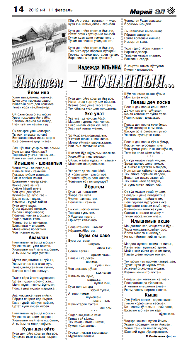 3. Ильина, Н. Илышем – шонанпыл… : почеламут-влак / Н. Ильина // Марий Эл. – 2012. – 11 февраль. – С. 14.