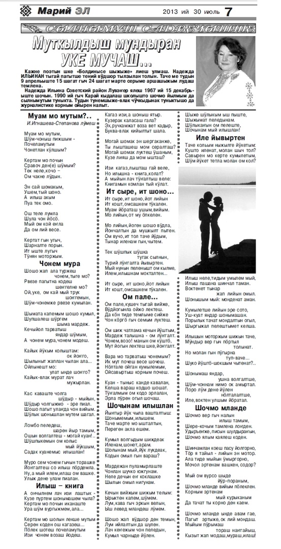 4. Ильина, Н. Муткылдыш мундыран уке мучаш… : почеламут-влак / Н. Ильина // Марий Эл. – 2013. – 30 июль. – С. 7.