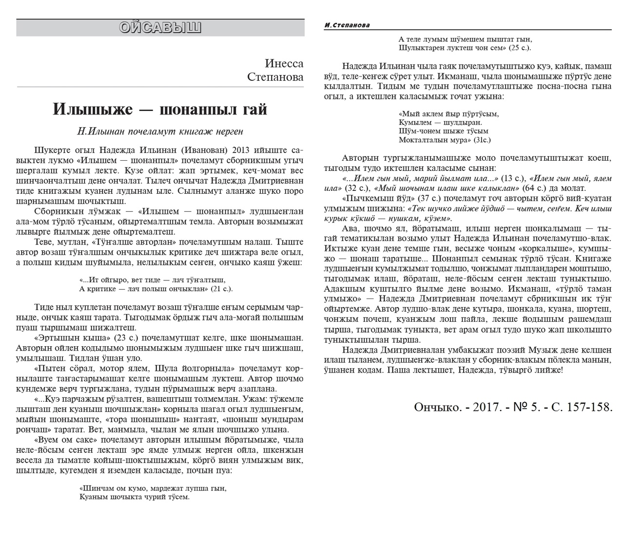 6. Степанова, И. Илышыже - шонанпыл гай / И. Степанова // Ончыко. - 2017. - № 5. - С. 157-158.