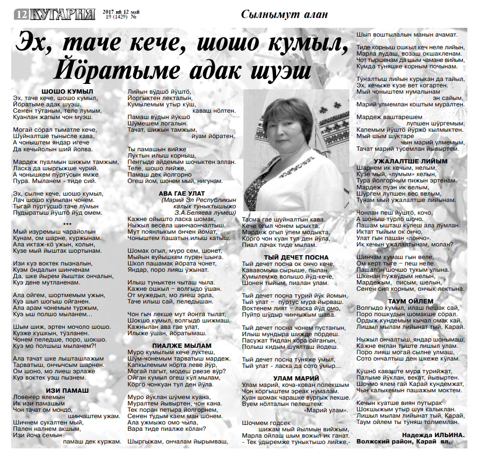 7. Ильина, Н. Эх, таче кече, шошо кумыл, йоратыме адак шуэш : почеламут-влак / Н. Ильина // Кугарня. – 201 – 12 май (№ 19). – С. 12.