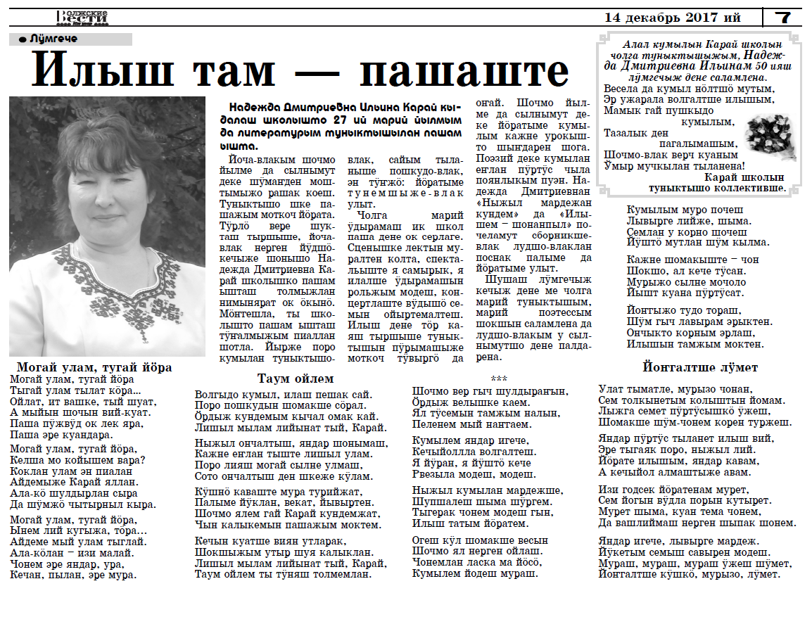 8. Ильина, Н. Илыш там – пашаште : почеламут-влак / Н. Ильина // Волжские вести. – 2017. – 14 декабря. – С. 7.