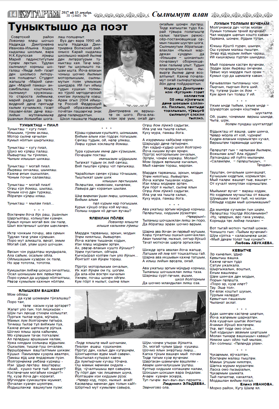9. Туныктышо да поэт // Кугарня. – 2017. – 15 декабрь (№ 50). – С. 14.