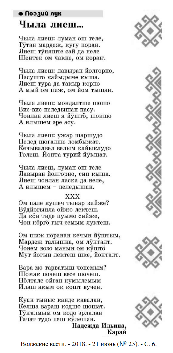 10. Ильина, Н. Чыла лиеш… : почеламут / Н. Ильина // Волжские вести. – 2018. - 21 июнь (№ 25). - С. 6.