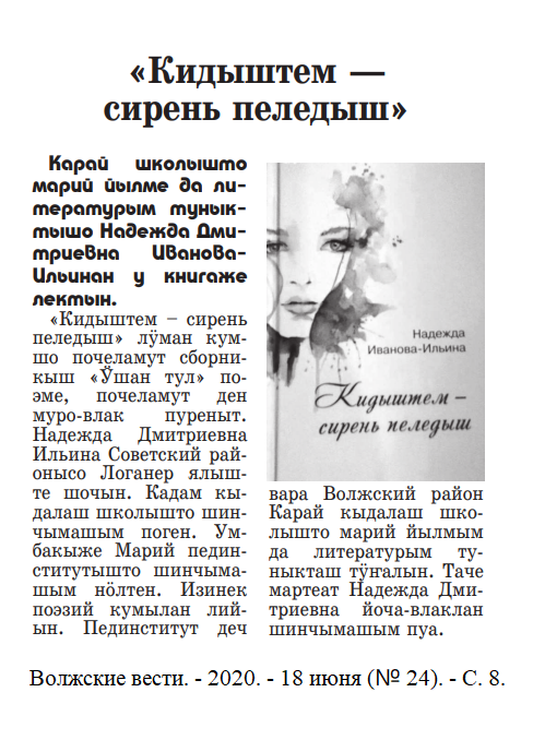 12. "Кидыштем - сирень пеледыш" : [Н. Д. Иванова-Ильинан у книгаже лектын] // Волжские вести. – 2020. - 18 июня (№ 24). - С. 8.