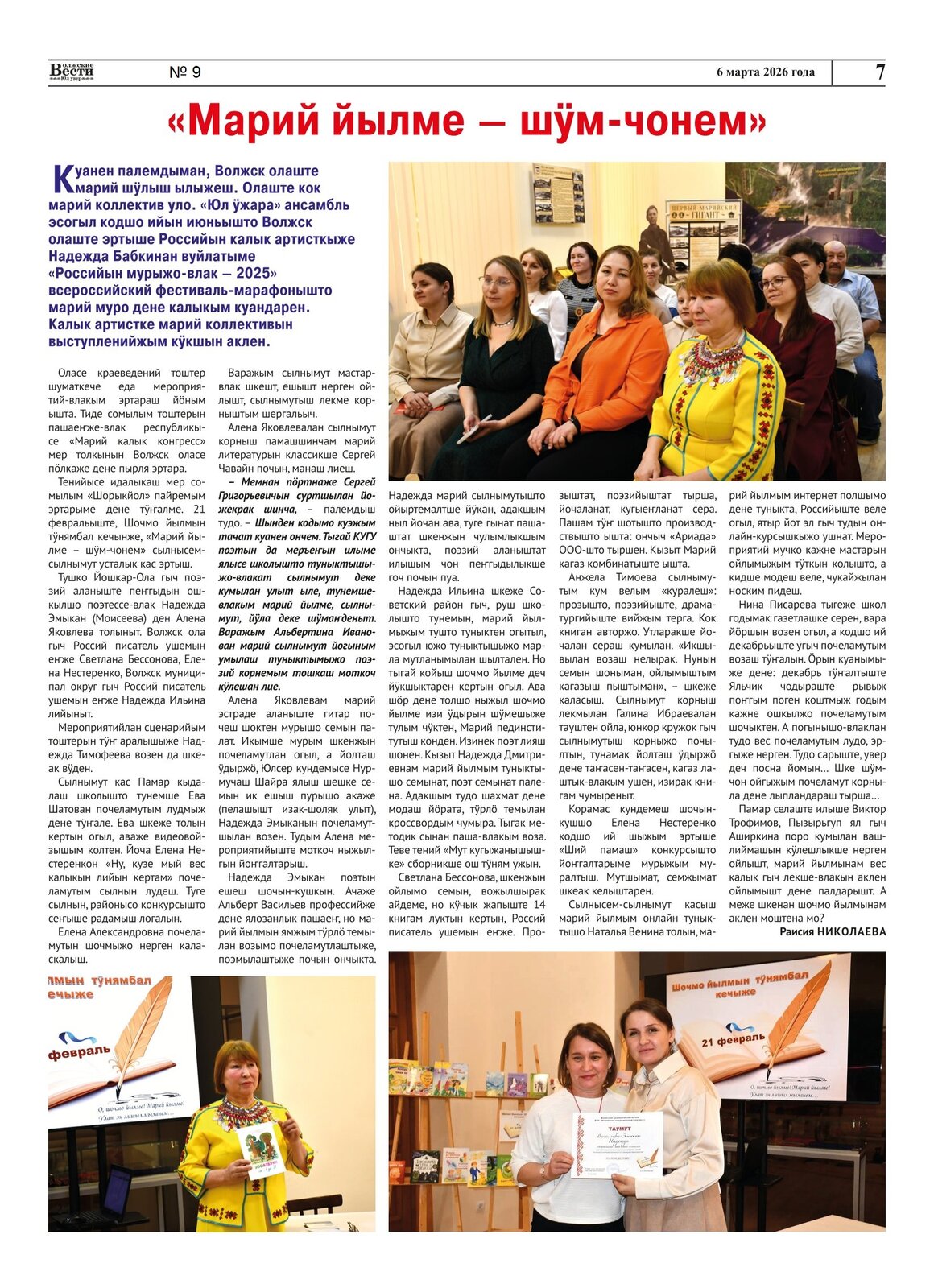 13. Николаева, Р. «Марий йылме – шум-чонем» / Раисия Николаева // Волжские вести. – 2026. – 6 март (№ 9). – С. 7.