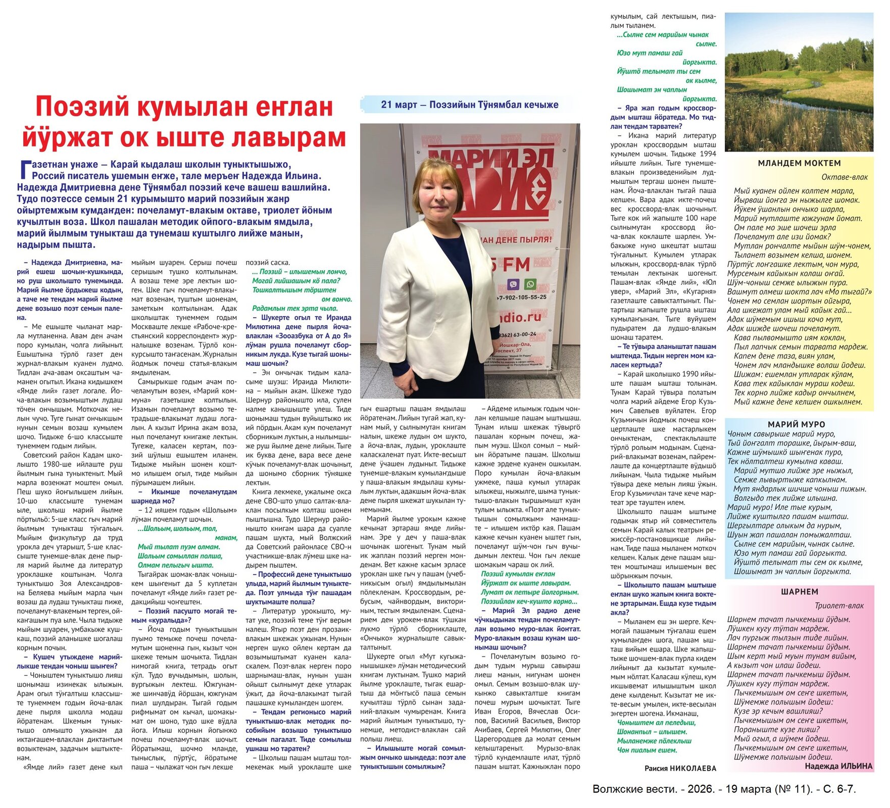 14. Ильина, Н. Д. Поэзий кумылан енлан йуржат ок ыште лавырам : [Карай кыдалаш школын туныктышыжо, Россий писатель ушемын енже Н. Д. Ильина дене мутланымаш] / Раисия Николаева возен налын // Волжские вести. – 2026. – 19 март (№ 11). – С. 6-7.