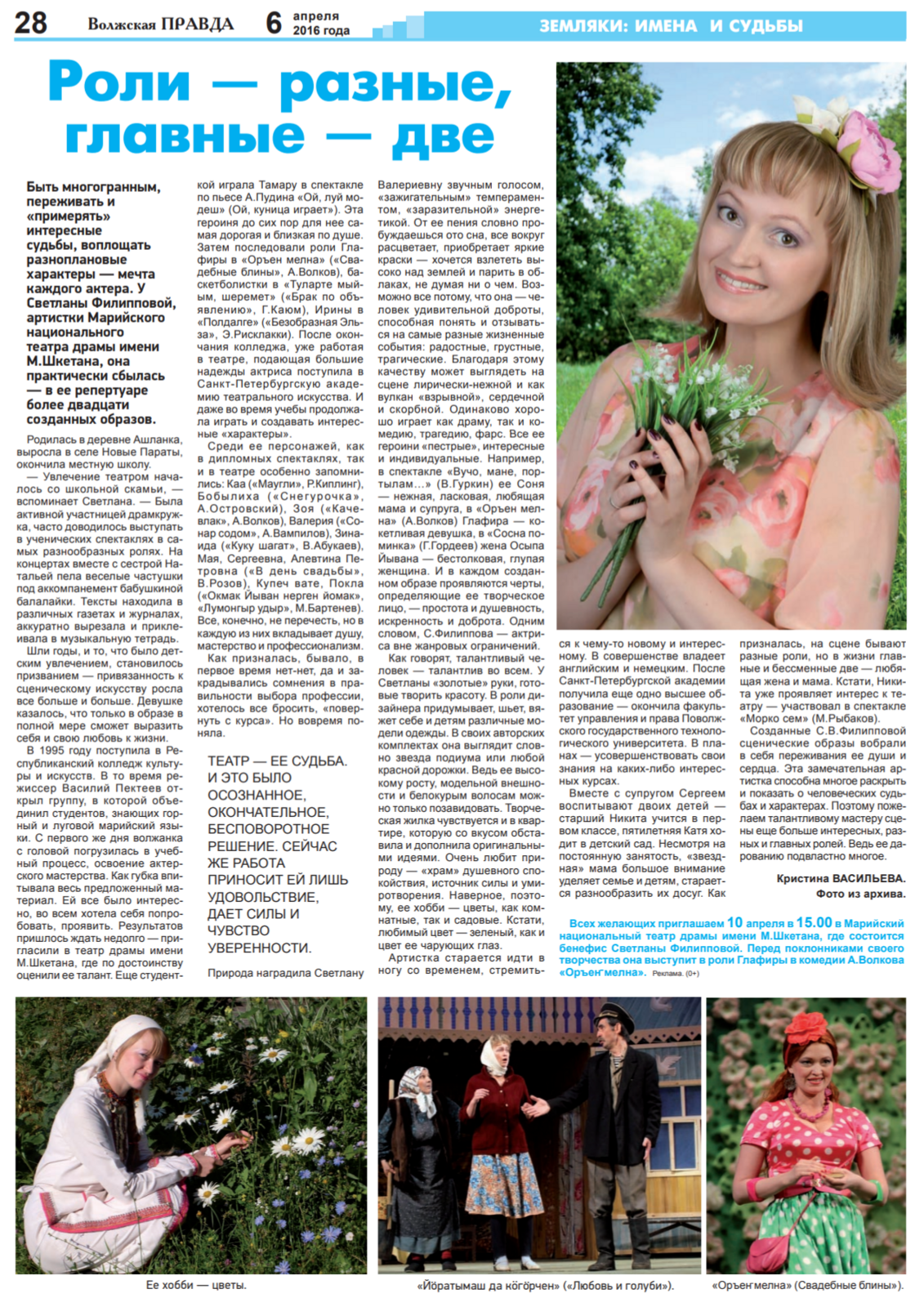 - Васильева, К. Роли - разные, главные – две / Кристина Васильева // Волжская правда. – 2016. - 6 апреля (№ 14). - С. 28.