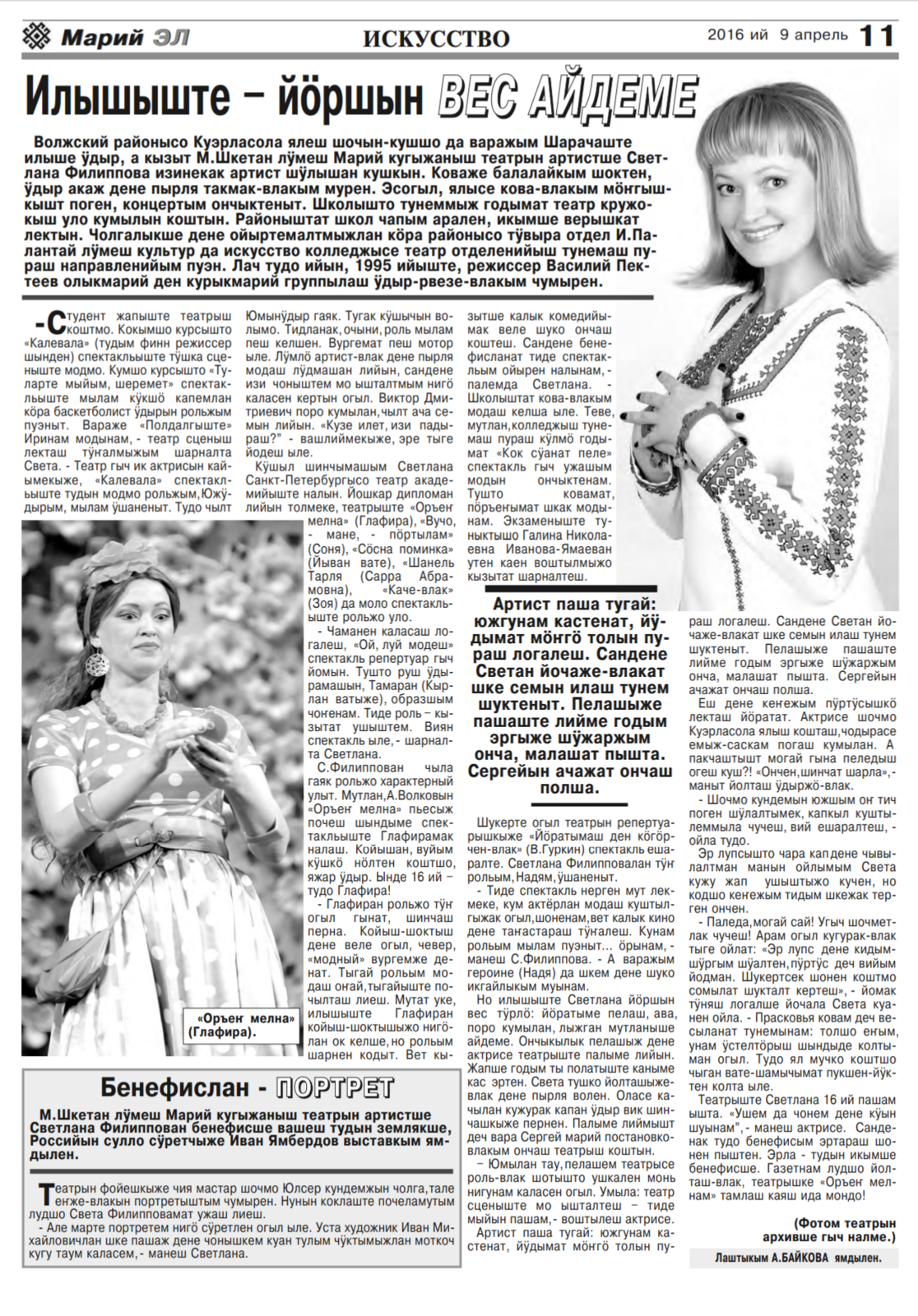- Байкова, А. Илышыште - йоршын вес айдеме / Алевтина Байкова // Марий Эл. – 2016. - 9 апрель. - С. 11.